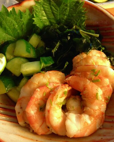 和食は冷たい品を作りやすい。色々と摘むイメージで。 ・若布と胡瓜と海老の酢の物 若布に刻んだ紫蘇を混ぜ込む。 海老は蒸して殻を剥き、汁ごと冷やす。 味付けはリンゴ酢、デーツ煮汁、醤油数滴、盛り付けてから海老からの汁とライム汁をまわしかけて、 刻…