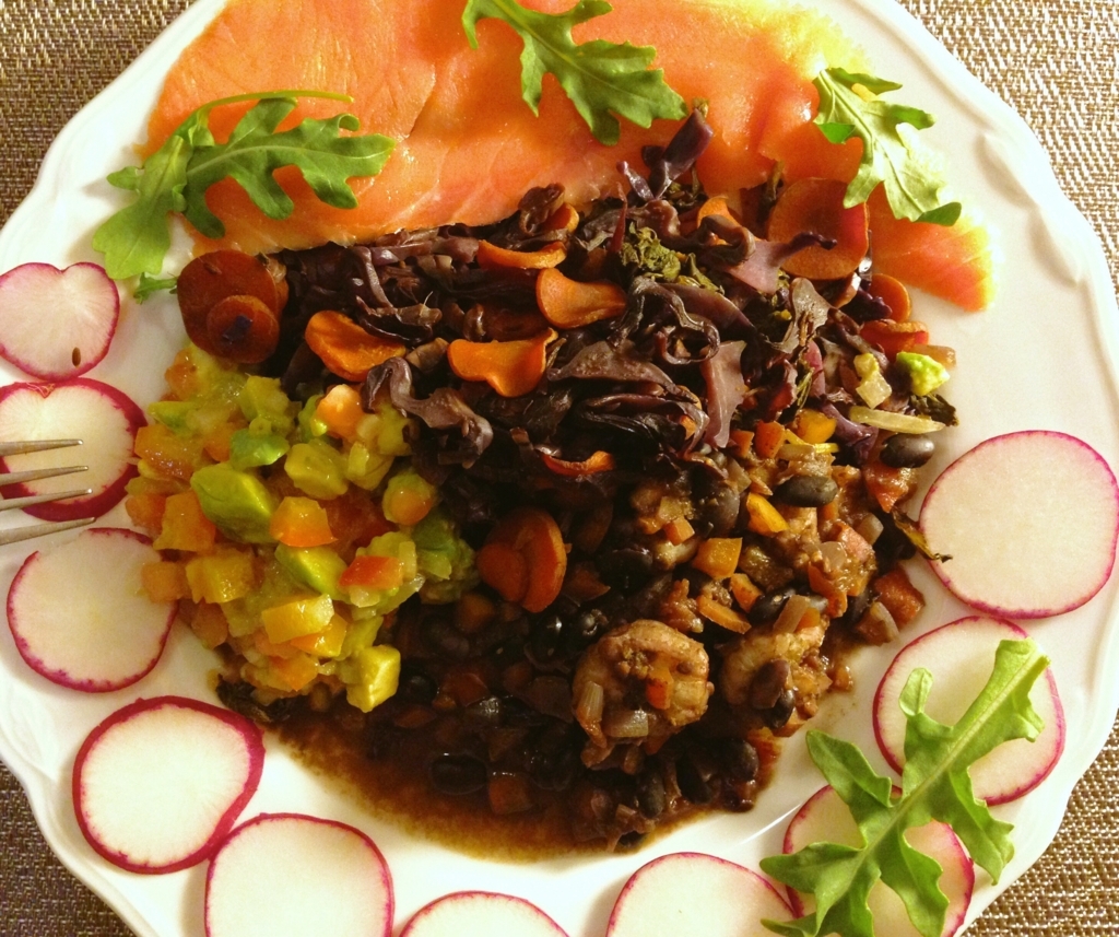 深さと縁のある皿を選び、温めておいた紫キャベツスパイス焼き、ワカモレ、豆煮込みは汁が混ざり合うのを前提に一緒に盛って、前菜&口直しのスモークサーモンとラディッシュは汁浸しにならないよう皿の縁に。