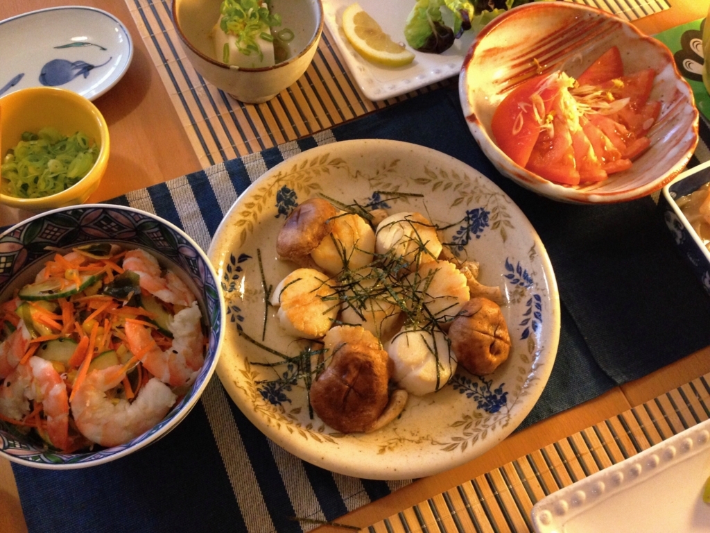 葉野菜を買いに行けず、冷蔵庫の野菜を刻むうちに、当初の思惑と大幅路線変更して出来上がった夕食。思いがけず賑わった。