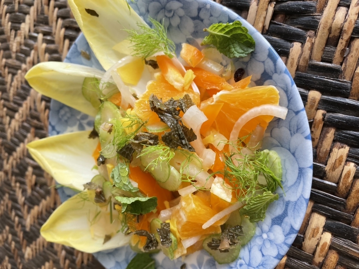 オレンジ、フェンネルの薄切り、オレンジパプリカ微塵切り、生姜少々に、ミントソースと青臭いオリーブオイルをかけて。サーモンとオレンジ、よく合います。