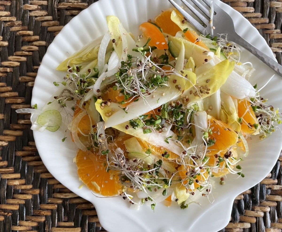 ・ラディッキョ(縦切り)・オレンジ(輪切りを1/4に分割)・オレンジパプリカ(薄切り)・フェンネル(薄切り)・きゅうり(薄切り)・ラディッシュ(薄切り)・キヌアタブーリ(作り置き)・ブロッコリースプラウト